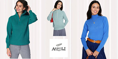 Дамски пуловери с марка Assuili - разнообразие от актуални модели в богата цветова гама и размери. Модели с високо съдържание на вълна, кашмир, памук и други естествени тъкани.