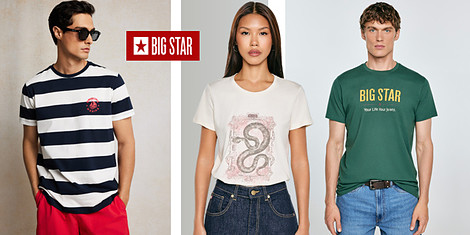 Селекция от дамски и мъжки тениски на Big Star. Размери от XS до 5XL.