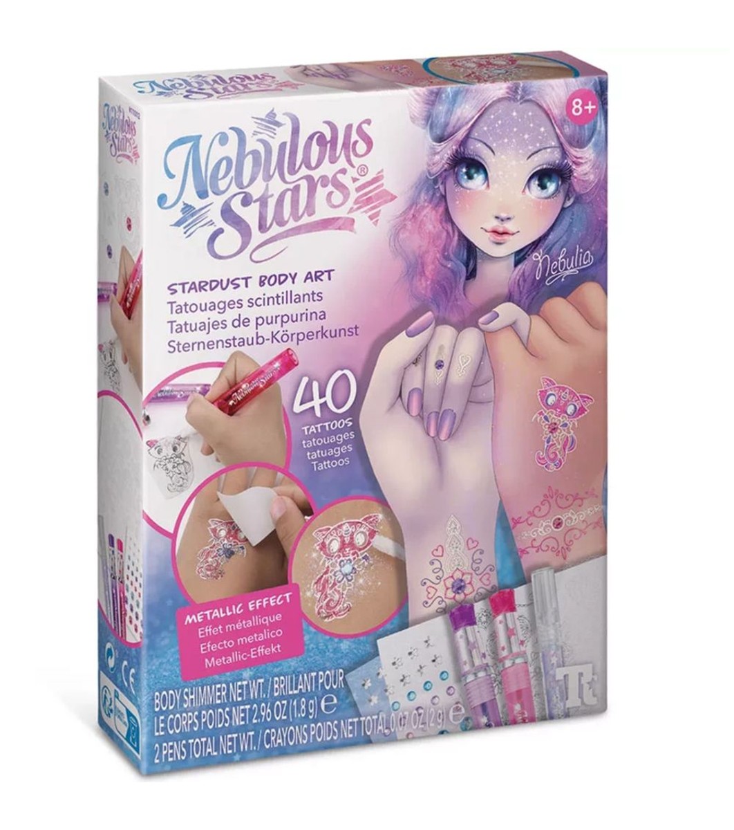 Заблестете като звезда с творческия комплект за тяло на Nebulous Stars! Използвайте временните татуировки от комплекта, за да украсите тялото си с красиви и космически дизайни! Химикалки за татуировки с металик мастило и стикери кристали ще ви помогнат да добавите блясък към Вашите татуировки!