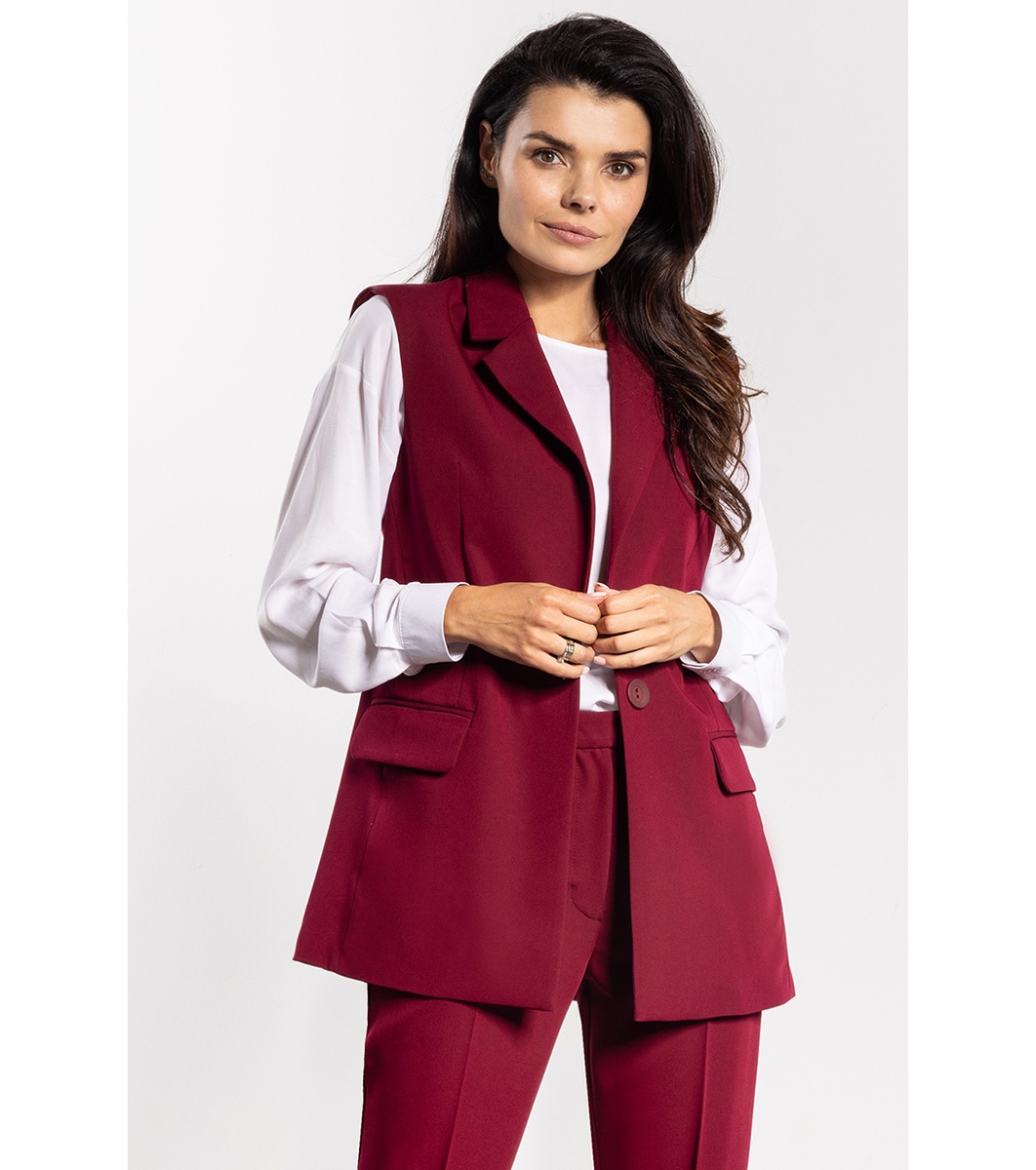 Дамска елегантна жилетка със семпъл, прав и удължен силует. Моделът е без ръкави, с ревер яка и едноредно закопчаване с един видим копч. Отпред има две джобчета с капачета. Гърбът е изчистен, с вертикален шев по средата. Дизайнът е гладък, без допълнителни декоративни елементи.