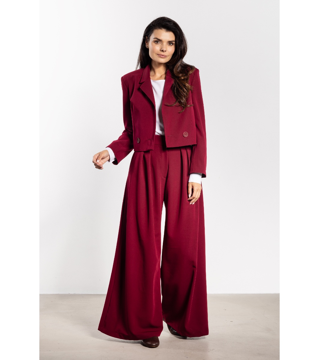 Дамско късо сако с прав, леко свободен силует и двуредно закопчаване с копчета отпред. Моделът е с класически реверни яки и дълги ръкави. Гърбът е изчистен с вертикален шев по средата. Сакото е без видими външни джобове и завършва около талията.