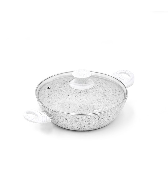 Тялото на съда от кован алуминий гарантира лекота на използване и най-добро разпределение на топлината, докато специалното покритие дава цялото качество на готвенето на камък.