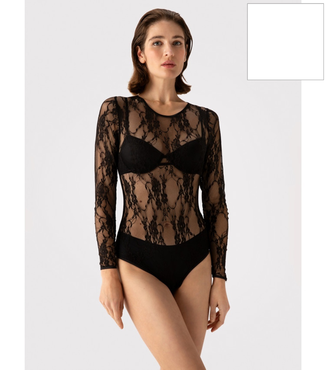 Боди от еластична дантела с флорален мотив и дълъг ръкав