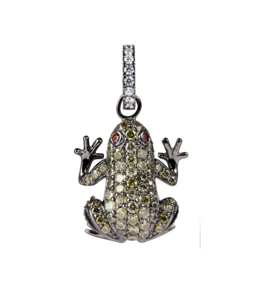 Тази висулка е създадена във формата на жаба, украсена с множество блестящи елементи. Дизайнът е изработен с внимание към детайла, като включва две отличителни очи. Закрепването е с пръстен, който е също инкрустиран с блестящи елементи.