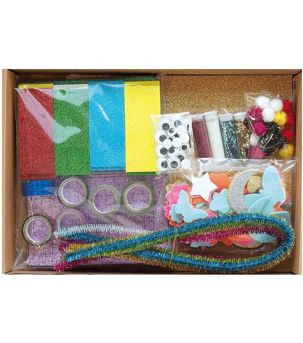 Комплектът съдържа 900 части сред които: Мъниста Пухчета Картон Въженца Брукат Лентички Меки частици