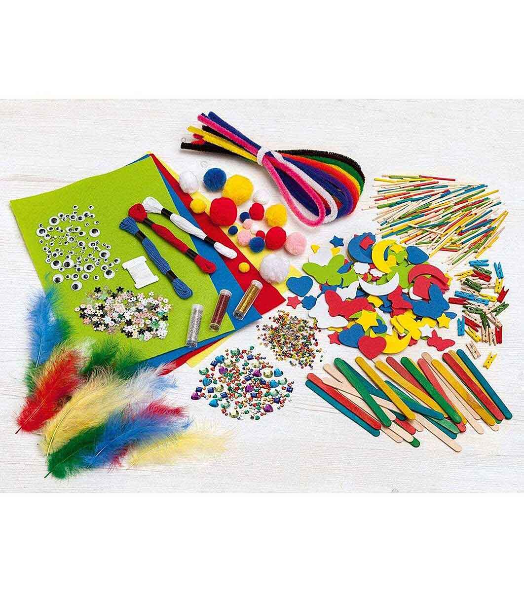 Комплектът съдържа 1300 части сред които: Мъниста Пухчета Картон Въженца Брукат Пръчици Меки частици