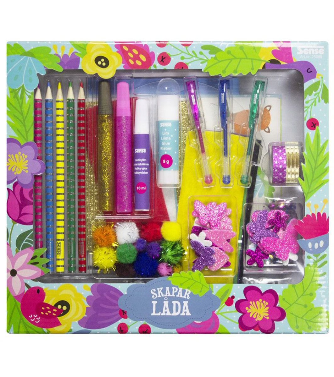 Двойни картички с пликове, шарени хартии, шаблон, самозалепваща се блестяща хартия, 2 листа сладки стикери, лепило, пайети, декоративно тиксо, декоративни мъниста, 3 гел химикалки, 5 цветни молива и други.