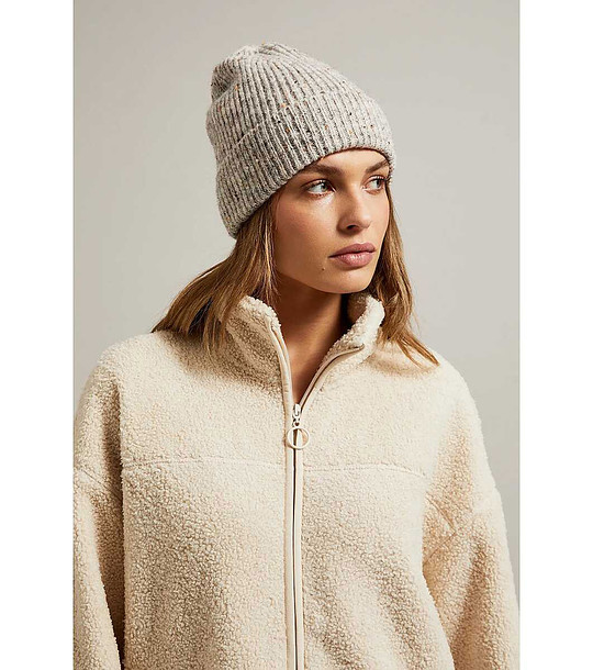 Елегантна бежова дамска шапка, изработена от нежна, рипсена материя в структурна ребра.