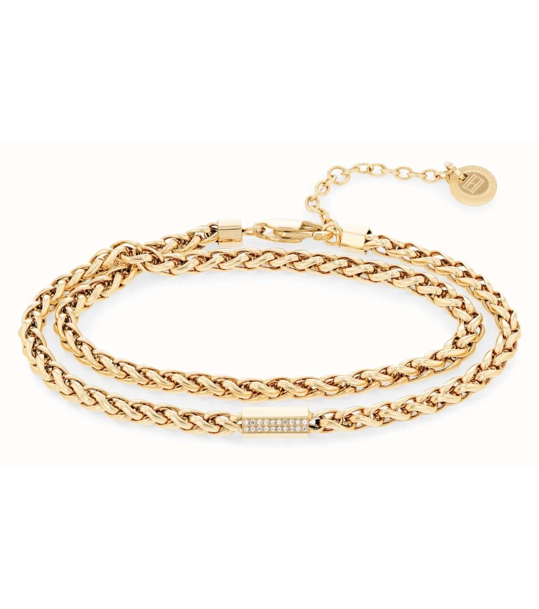 Изискана гривна с плетена верижка, завършваща с карабинер за лесно закопчаване. Детайлен акцент с малки декоративни елементи придава допълнителен блясък.