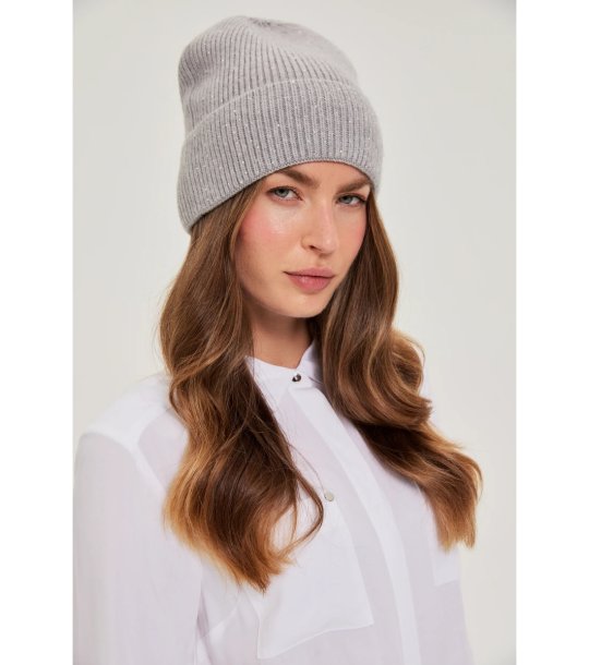 Шапката е с рипсена плетка и класически дизайн.