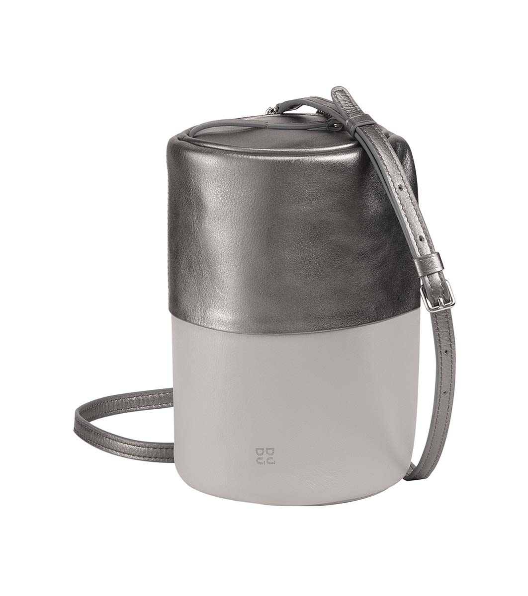Дамска цилиндрична кожена чанта в сиво и сребристо Abigail