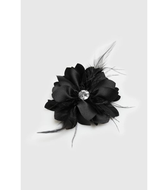 Елегантна брошка с форма на цвете. В центъра е разположен декоративен елемент, който добавя блясък. Задната част е оборудвана с метален клипс за лесно прикрепяне.