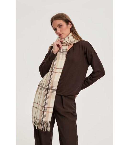 Шалът е с класически каре дизайн и ресни в краищата. Подходящ е за есенно-зимния сезон, предоставяйки комфорт и стил.