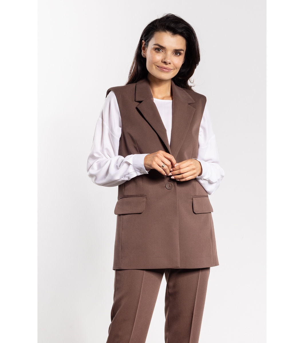 Дамски елек с прав, класически силует и леко удължена дължина. Моделът е без ръкави, с ревер яка и едноредно закопчаване с един бутон отпред. Отпред има две функционални джобчета с капак. Гърбът е изчистен, с деликатни шлицове в долната част за по-голям комфорт при движение. Елекът е с гладка структура и фино подчертани рамене.