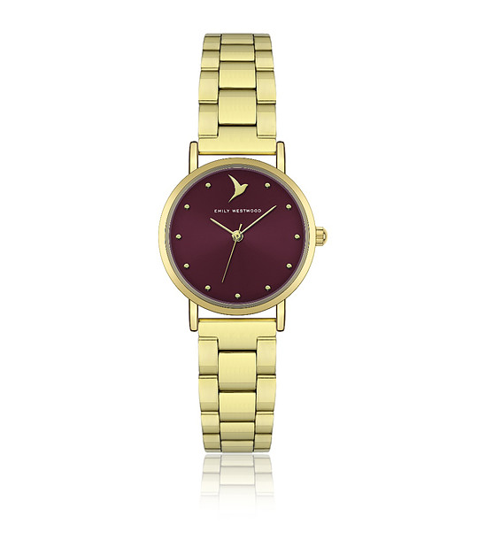 Дамски часовник в златисто с циферблат в бордо