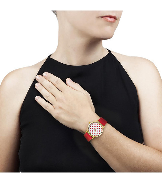 Дамски часовник в червено и златисто на точки