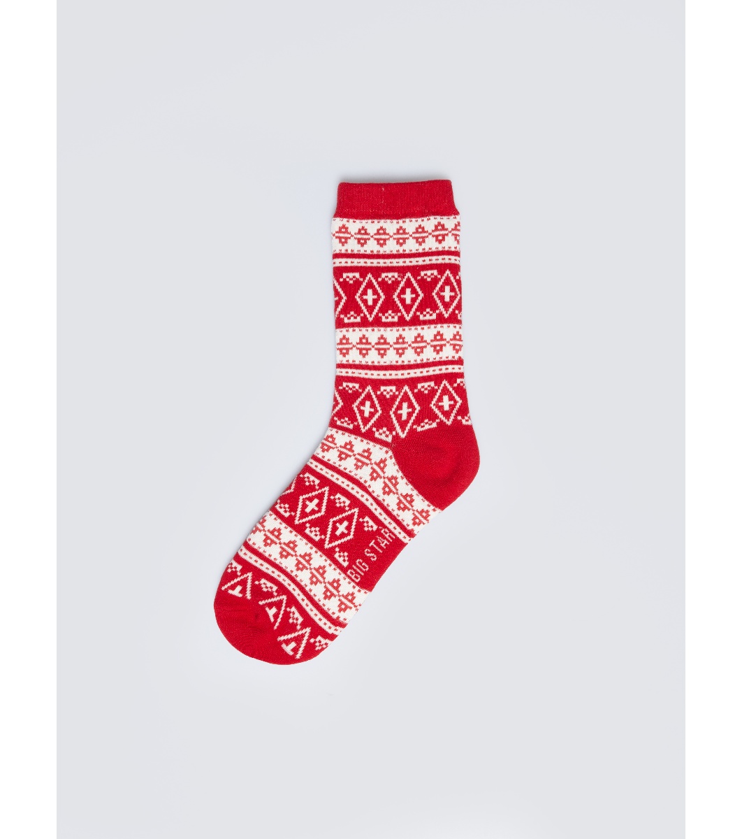 Дамски дълги чорапи с жакардов геометричен десен. Мека плътна плетка. Ластичен горен ръб. Подсилена пета и пръсти. Контрастно лого в долната част на ходилото.
