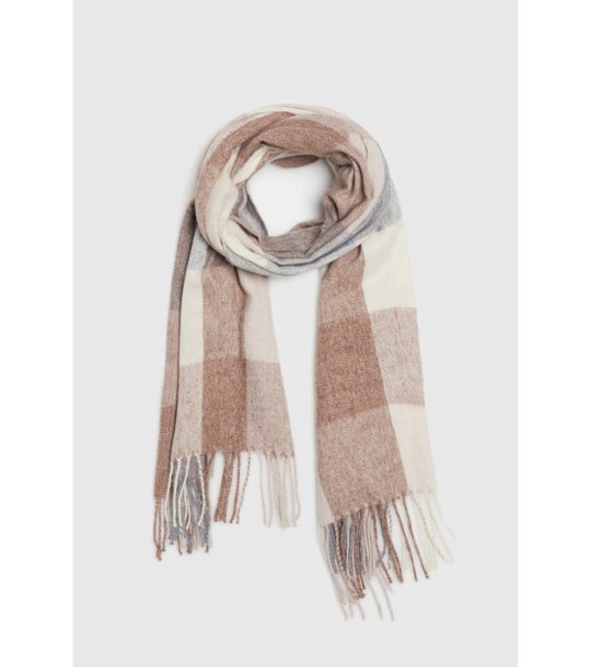 Шалът е с геометричен десен и ресни по краищата.