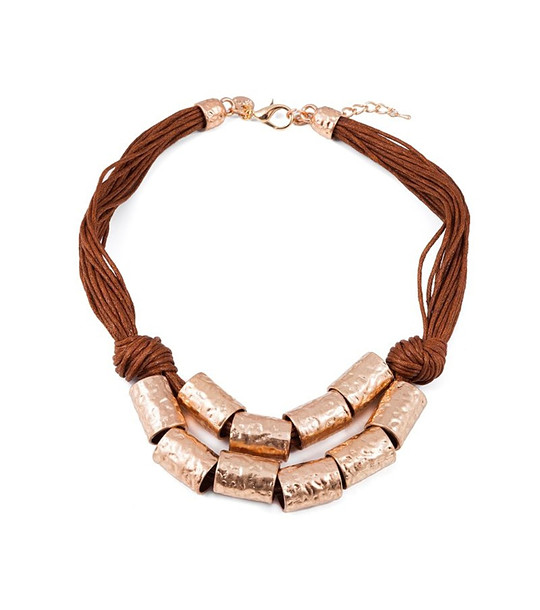 Оригинално колие с множество шнурчета и позлатени цилиндри. Регулируема дължина
