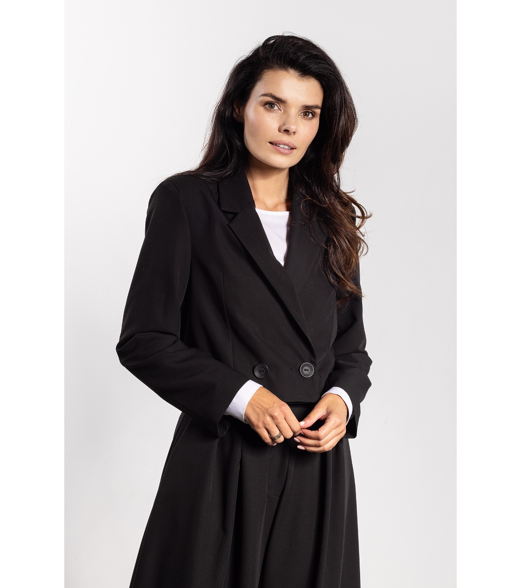 Дамско сако с двуредно закопчаване с два копчета отпред. Моделът е с къс, прав и леко свободен силует. Има класически ревер и право рамо с лека конструкция. Гърбът е изчистен с вертикален шев по средата. Ръкавите са дълги и прави. Предната част е гладка, без видими джобове. Долната линия на сакото завършва над ханша.