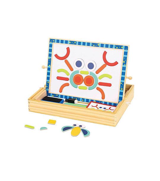 Двустранна магнитна дъска, състояща се от 117 части.От едната страна ще откриете магнитна дъска. С помощта на различните по форма и цветове магнити ще можете да следвате и подредите 30 различни картинки със степенувани нива на трудност.