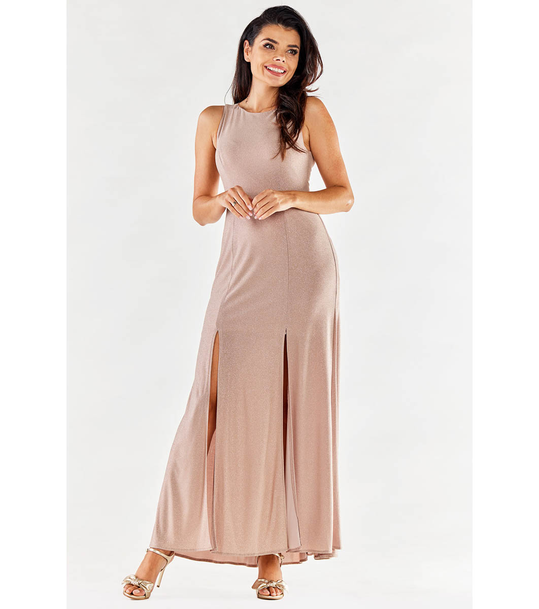 Дълга бежова ефектна рокля с брокатен ефект Tonika