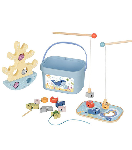 Този многофункционален комплект комбинира три любими детски занимания в едно: магнитен риболов нанизване на елементи редене и балансиране.