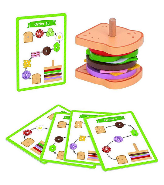 Комплектът включва 15 части:10 дървени елемента, с които се "приготвя" сандвич;5 карти с 10 различни начина за приготвяне (шаблони).