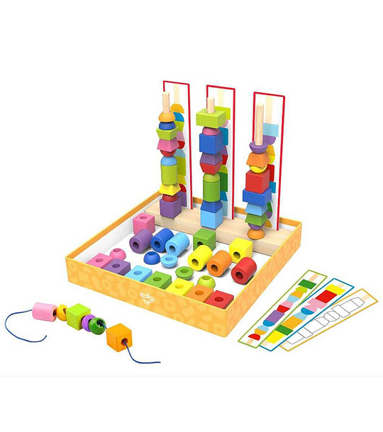 Има 68 части, сред които са дървени блокчета за нанизване, въженца, шаблони и низанка.