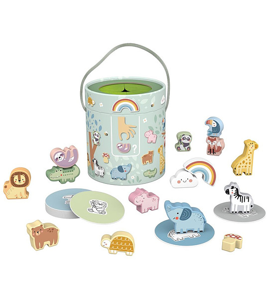 Комплектът включва 15 красиво изработени дървени фигурки на животни и 15 картонени карти, всяка с изображение на едно от животните.