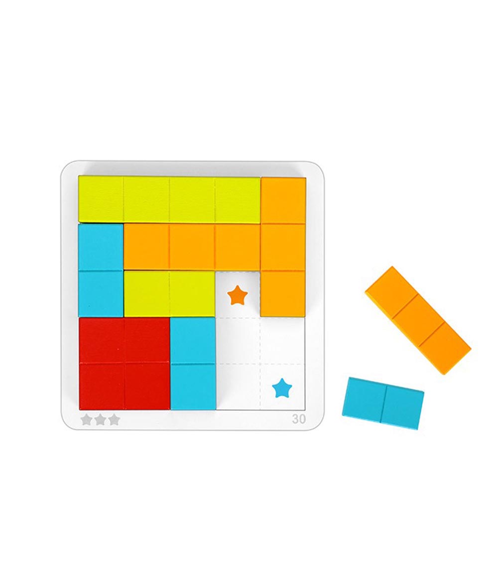 В комплектът има карти с нивата, които детето трябва да мине и дървени блокчета с различен цвят и брой квадратчета.