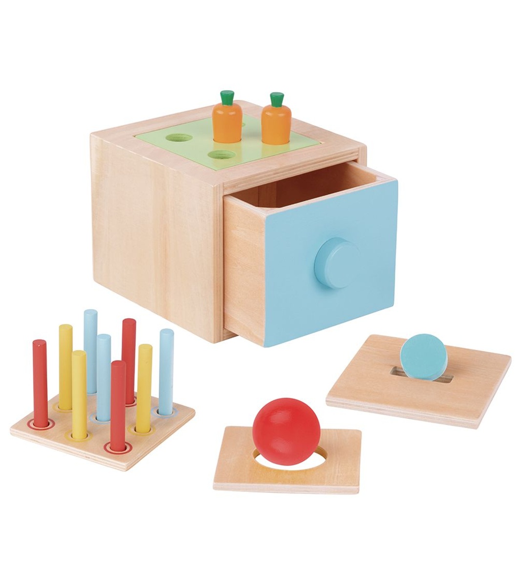 Той включва 4 дървени формирани дъски с различни елементи за сортиране, вмъкване и разпознаване, които подпомагат развитието на фината моторика, координацията око-ръка, логическото мислене и разпознаването на цветове и форми.