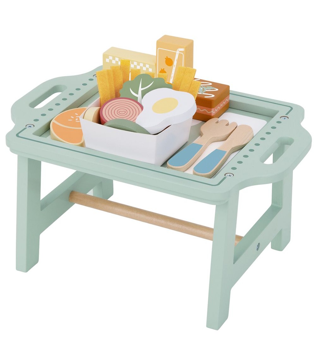 Комплектът включва: 1 дървен поднос с крачета; 12 дървени хранителни елемента – яйце, домат, гъба, лук, масло, кроасан и други; 1 дървен нож и 1 дървена вилица; 1 картонено меню; 10 парченца „пържени картофки“ от филц; 1 филцова кутийка за тях; След сглобяване, масичката за закуска е с размери 29 x 20 x 15 см, удобна както за игра на пода, така и върху детска масичка.