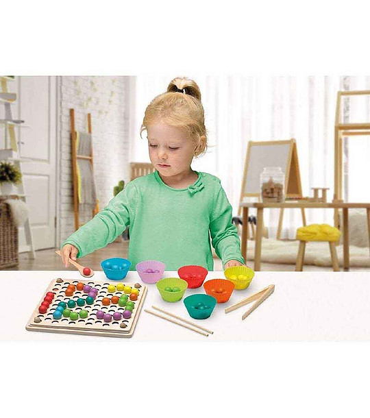 Бъдете готови! Съсредоточете се! Вземете топчето и го поставете на мястото с правилния цвят.Има 3 начина, по които да поставите топчето на правилното място: с лъжица, щипки или пръчки. Станете майстор и на трите. Играта има 10 шаблона, като 8 са попълнени и 2 са оставени да попълните сами.Играта е подходяща както за самостоятелно забавление, така и да бъде споделена от няколко човека. Играта спомага за развиването на фините двигателни умения, координацията между ръцете и очите, както и логическото мислене. Тя е забавна и атрактивна. Ще успее да предизвика широки усмивки по лицата на малчуганите. Единственото, което се изисква от Вас, е да проявите концентрация и логическо мислене.
