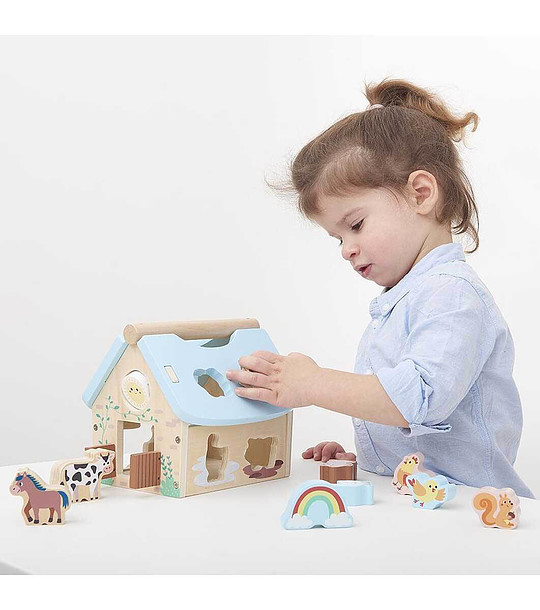 На всяка страна на фермата ще намерите отвори, в които влизат точно определи животни. В комплекта ще намерите 8 животни и фигурки с изображения на слънчице и дъга. За всички тях малчуганите ще трябва да намерят отвор в къщичката. За да излязат животните от фермата можете да използвате вратичката.В сичко това, допълнено от цветните рисунки по стените и удобния за хващане от малките ръчички размер, превръщат сортера в любима играчка.