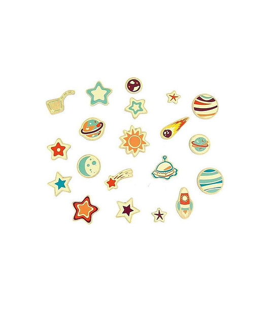 Този комплект от цветни и забавни магнити предлага разнообразие от 20 космически обекти и елементи като планети, ракети и звезди, които могат да се подреждат върху всякакви магнитни повърхности.