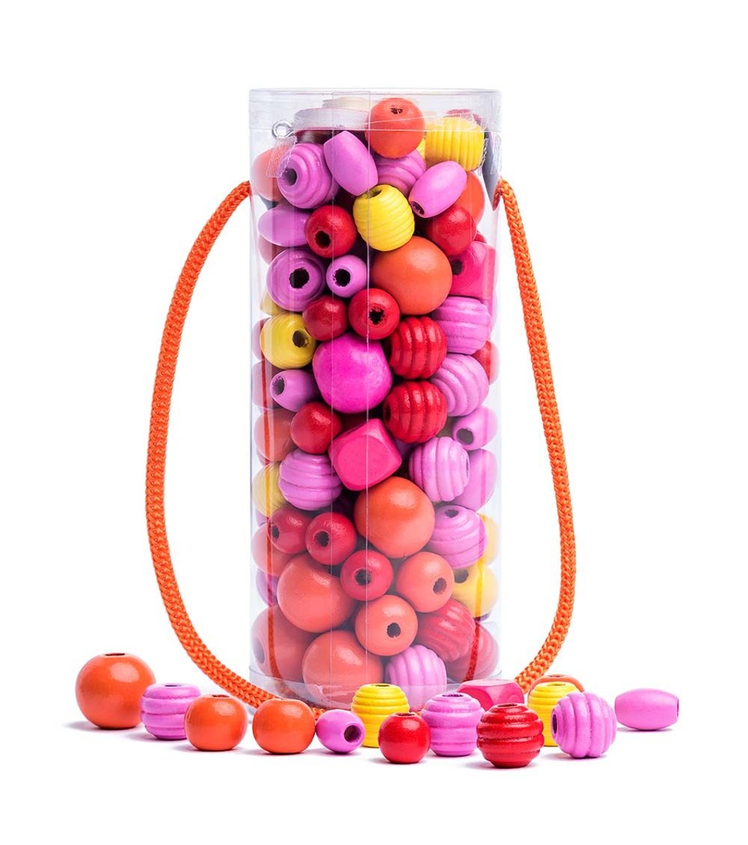 Комплектът съдържа около 200 бр. пъстри дървени мъниста - жълти, оранжеви, розови, лилави и червени, в различни форми и големини, 2 бр. медальона - цвете и сърчице и цветни въженца за нанизване.