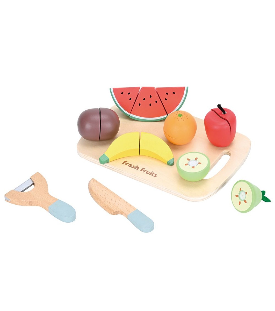 Комплектът включва дървена дъска за рязане, нож, белачка и шест различни цветни плода – диня, круша, банан, портокал, ябълка и киви. Всеки плод е изработен от безопасно и здраво дърво, оцветено с нетоксични бои на водна основа, гарантиращи безопасност дори при игра от най-малките. Благодарение на вградените велкро лепенки, плодовете могат да се „разрязват“ и отново съединяват, което прави играта още по-реалистична и увлекателна. Децата се учат как да държат нож, да режат внимателно и да разпознават различните плодове, цветове и форми.