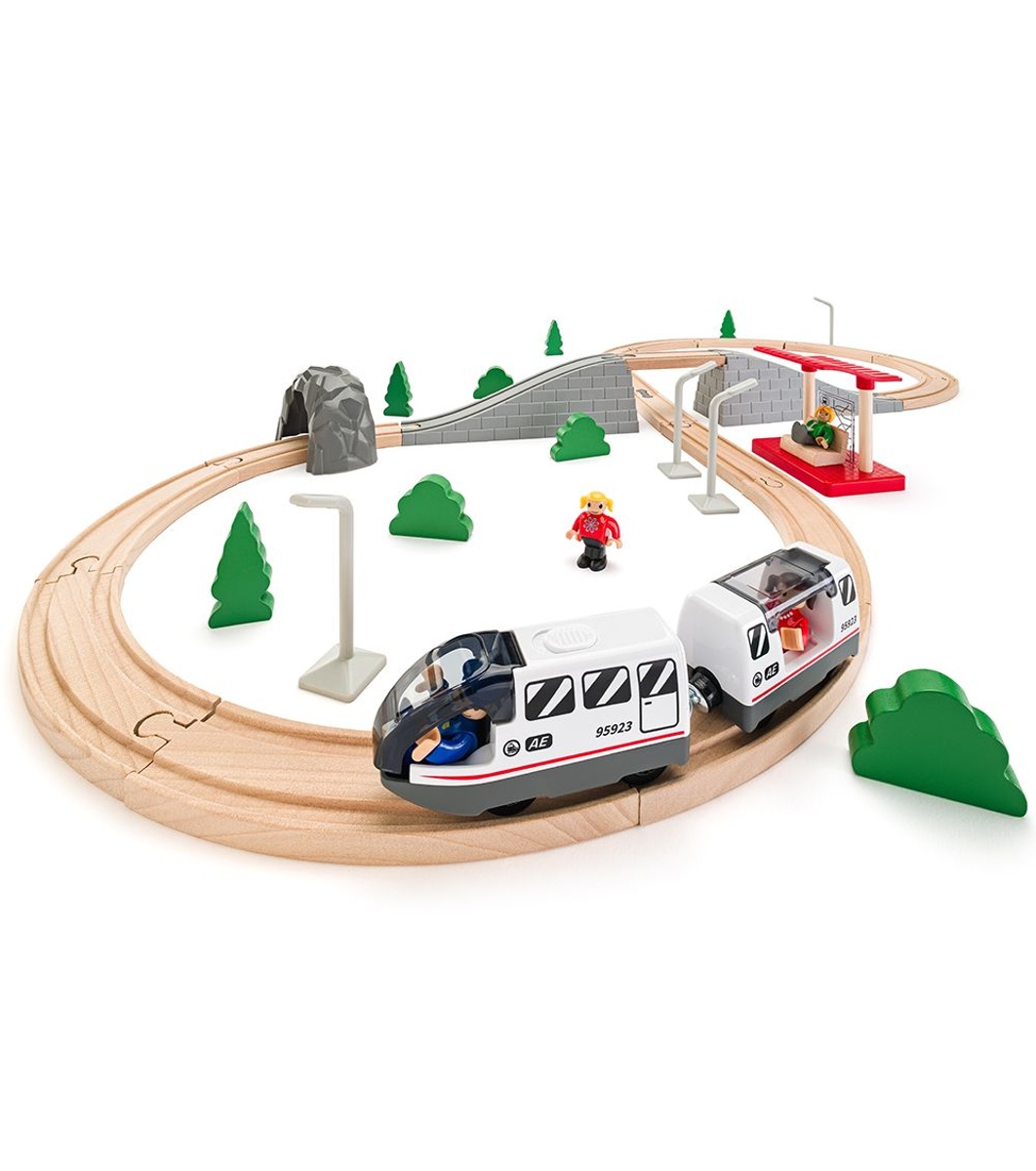 Комплектът съдържа 45 части, включително релси, локомотив, вагончета и разнообразни аксесоари, които създават цял миниатюрен свят за игра. Локомотивът се задвижва с батерия, което позволява на влакчето да се движи самостоятелно по релсите – още повече забавление за малките машинисти! Всички елементи са изработени от висококачествено естествено дърво, безопасно за деца и сертифицирано по европейските стандарти. Комплектът е съвместим с повечето стандартни дървени влакови релси на Woodyland, Lelin Toys, Brio, влакчетата на Ikea.