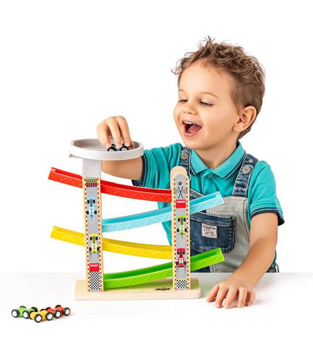 Всяко дете иска бърза писта за своите колички. С това дървено роли ще може да пуска количките отново и отново. Когато постави количката в началото, тя тръгва надолу и на всеки от етажите, се премята и продължава по пътя си.