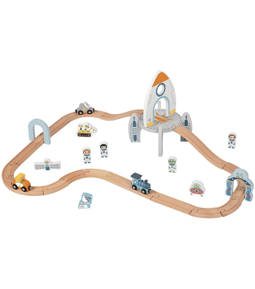 Какво включва комплектът: дървени релси (съвместими с повечето стандартни марки) локомотив с два вагончета; голям модулен ракетен център (основен декоративен и конструктивен елемент); космически аксесоари: сателит, луноход, НЛО, арка с извънземно фигури на астронавти и други декоративни елементи