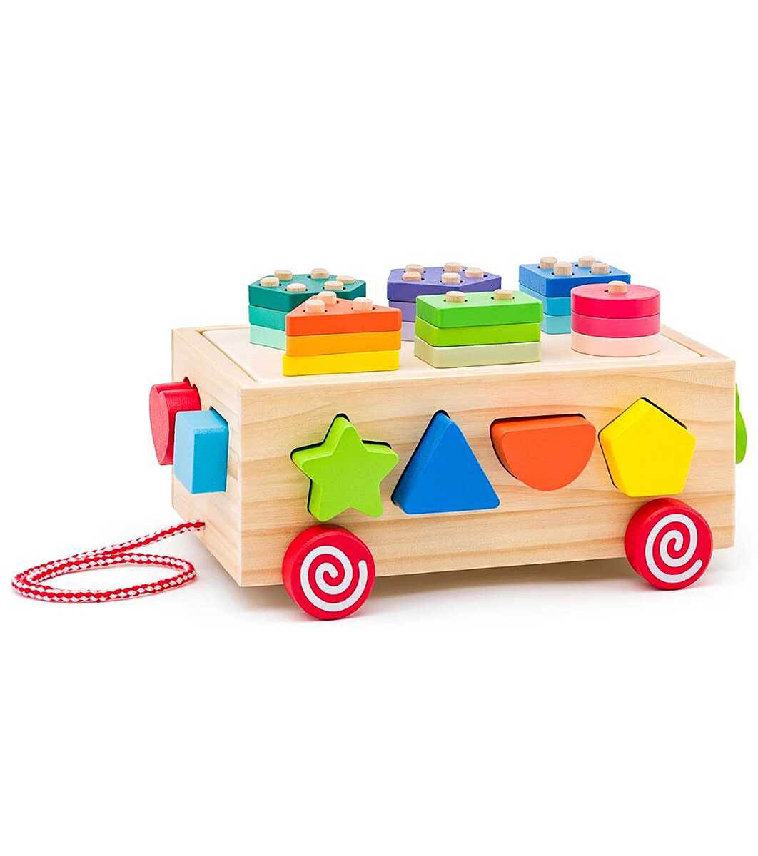 Весело дидактическо камионче за дърпане, на закрито и открито, с множество формички за усвояване, сортиране и подреждане.