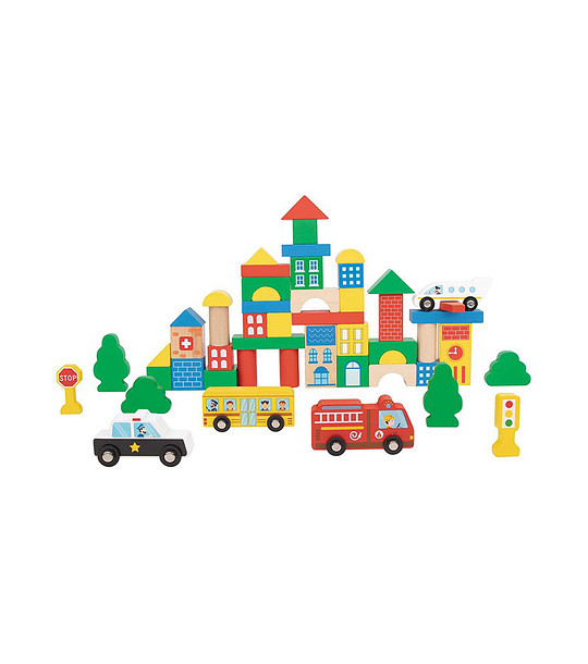 Безкрайни дизайни на градове предлага този дървен конструкор с цветни блокчета, къщички, дървета, пътни знаци и колички.