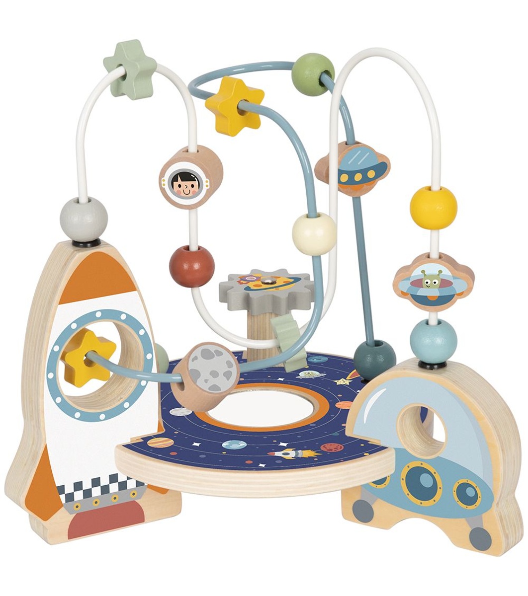 Със своята форма на ракета и цветна армирана жица, този лабиринт отвежда децата на междузвездно пътешествие из планети, орбити и галактики. Развиващи елементи: цветни мъниста, движещи се по метални жици; помага за развитие на координацията между ръцете и очите; насърчава логическото мислене и фината моторика.