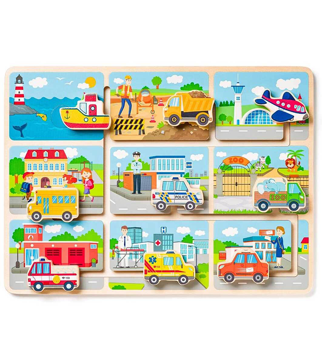 Докато паркира линейката пред болницата, акустира лодката на пристанището, насочва самолета за кацане, превозва децата към училището, спасява хора от пожари ..., малчуганът тренира пространственото мислене и развитието на фините двигателни умения.