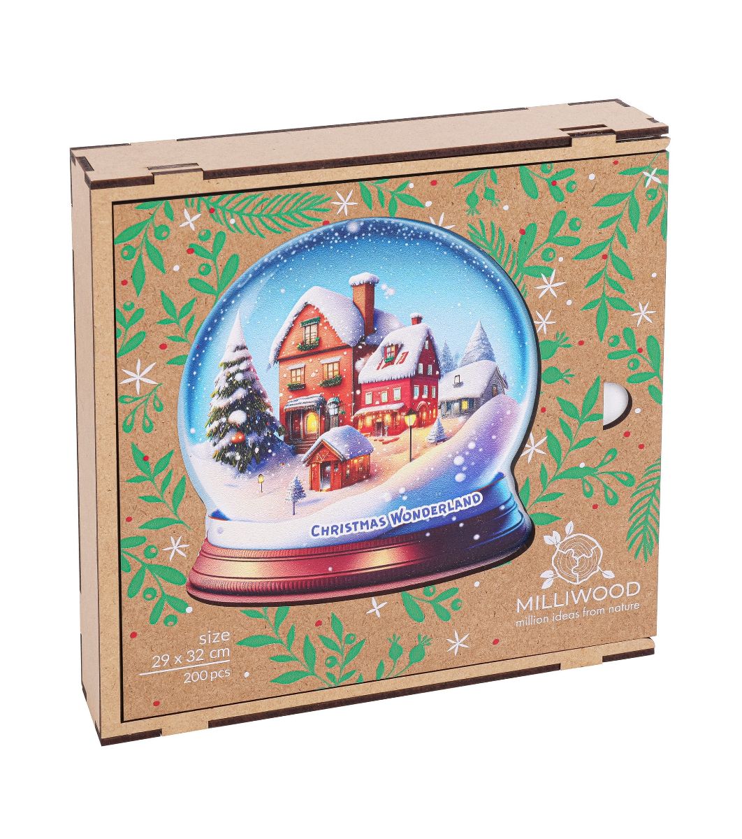 Внесете магията на Коледа в дома си с този дървен пъзел във формата на снежно кълбо. В средата на кълбото се намира живописно градче, покрито с дебел слой сняг. Представете си, какво е да се разхождате по улиците на това градче, слушайки звука на стъпки в снега. С всяка част на пъзела ще откривате нови детайли: украсени къщи, коледни светлинки и елхи, покрити със сняг.