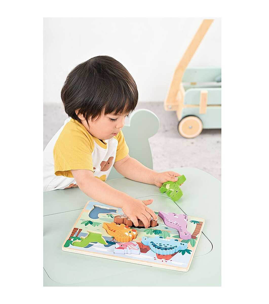 Седем симпатични динозавърчета очакват от мъниците да открият техните места и да попълнят праисторическия декор.
