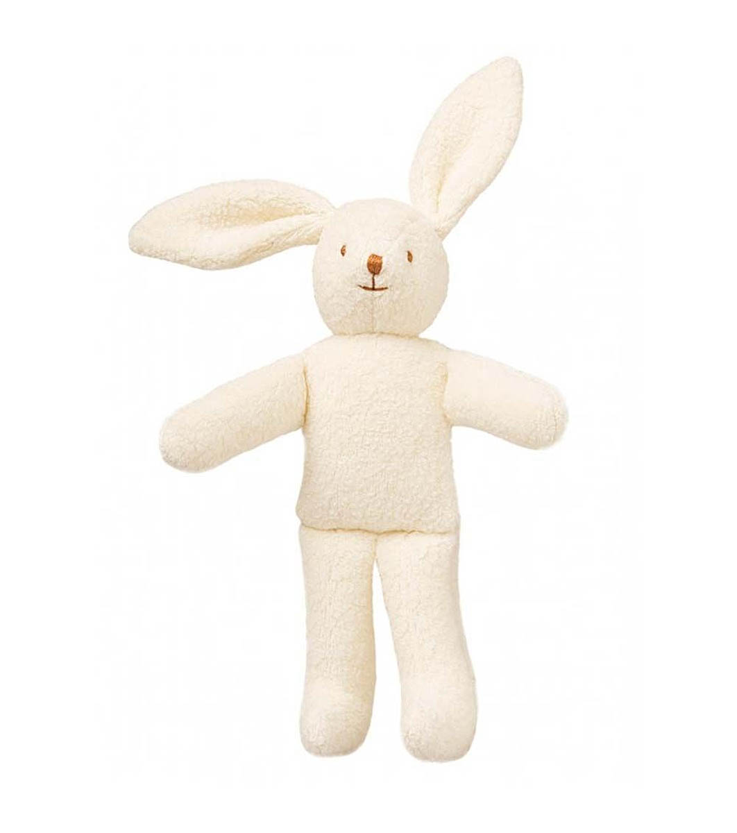 Плюшеното зайче в екрю е идеално допълнение за детското креватче. Когато го разклатите дрънка. Дрънкалката се намира в коремчето на зайчето.