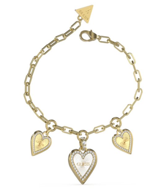 Гривна с елементи, оформени като сърца, които са декорирани с фини детайли. Верижката е изработена с карабинер закопчалка.
