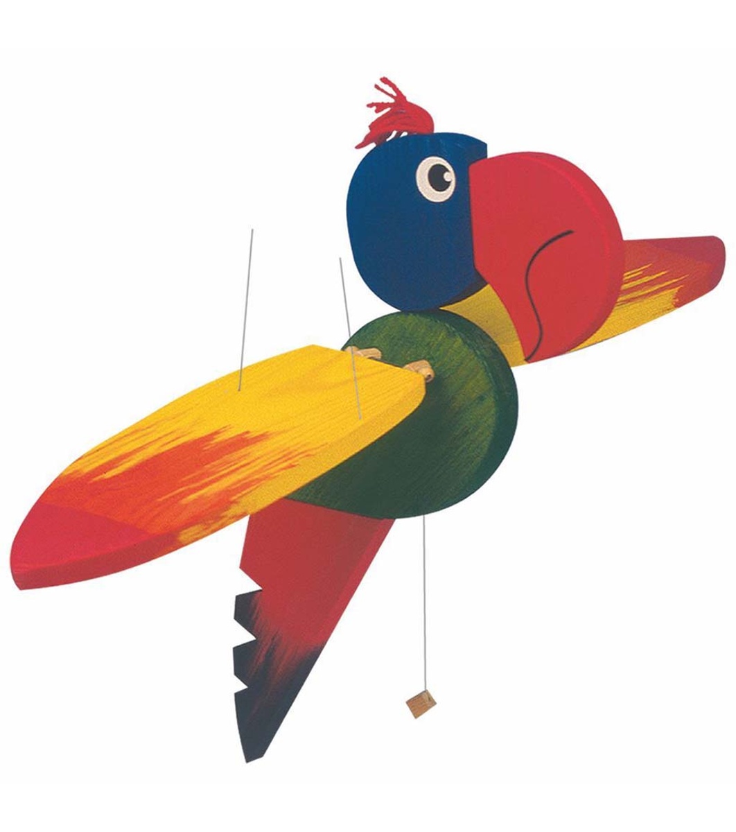 При дърпане на връвчицата, папагалът започва да маха с криле.